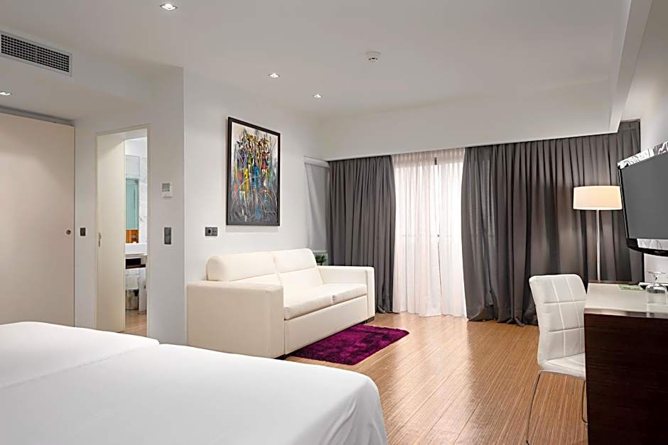 The spacious twin/double room features air conditioning, soundproof walls, a balcony with garden views as well as a private bathroom boasting a walk-in shower.